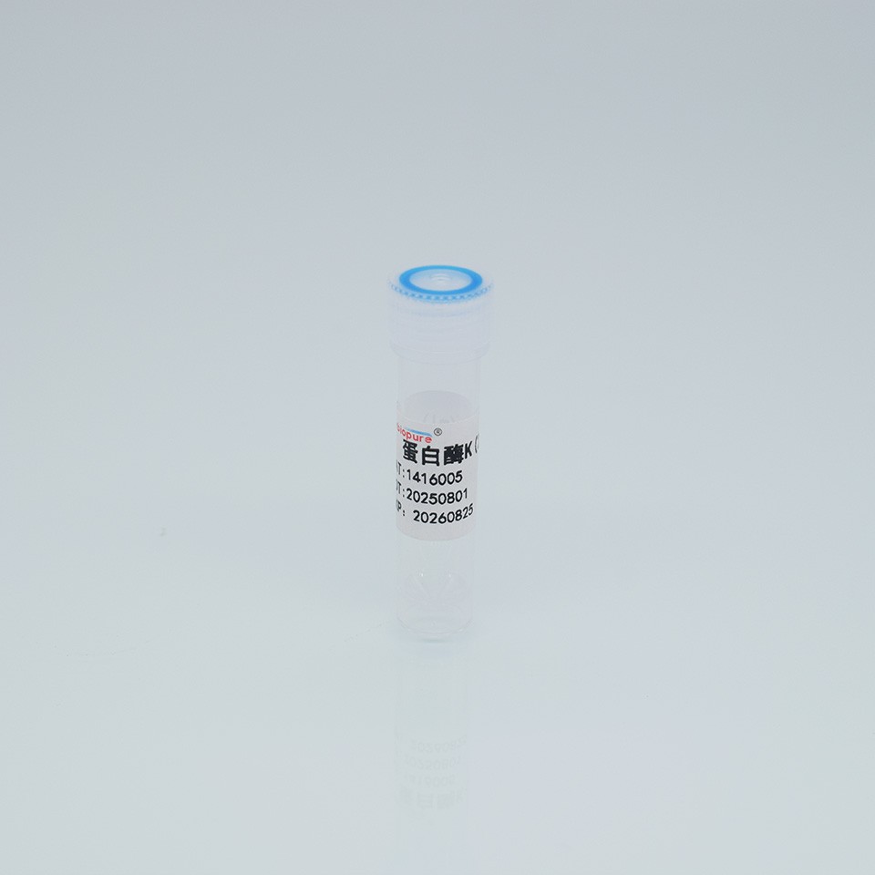 蛋白酶K(Proteinase K),相對分子量約為29.3 kDa, 是一種切割活性較廣的絲氨酸蛋白酶。可切割脂族氨基酸和芳香族氨基酸的羧基端肽鍵,應用廣泛,可用于制備脈沖電泳的染色體DNA,蛋白質印跡以及去除DNA和RNA制備中的核酸酶等實驗,蛋白酶K的一般工作濃度是50—100μg /ml。因蛋白酶K在變性劑如SDS(1%)中可提高其活性,所以在使用中,常根據所用緩沖液是否含有SDS、尿素、pH、溫度等因素確定具體的工作濃度。蛋白酶K在較廣的pH范圍內(pH 4-12.5)均有活性。