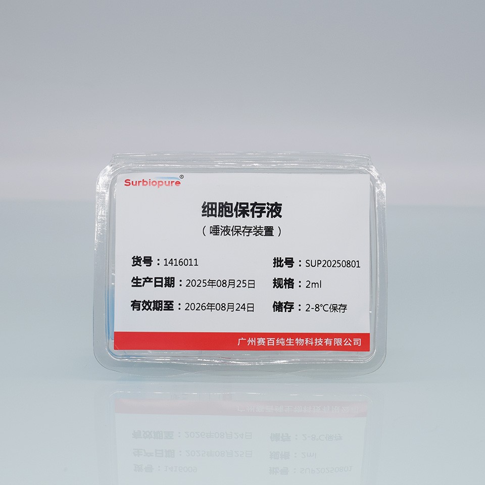 本產品通過唾液采集器和唾液收集管對唾液樣本進行采集、儲存;采集后,將細胞保存液全部倒入唾液收集管中,上下搖動采集管,充分與細胞保存液混合,能夠保證唾液樣本內DNA的完整性,并且可以在室溫(15℃~25℃)條件下的長期保存6個月。